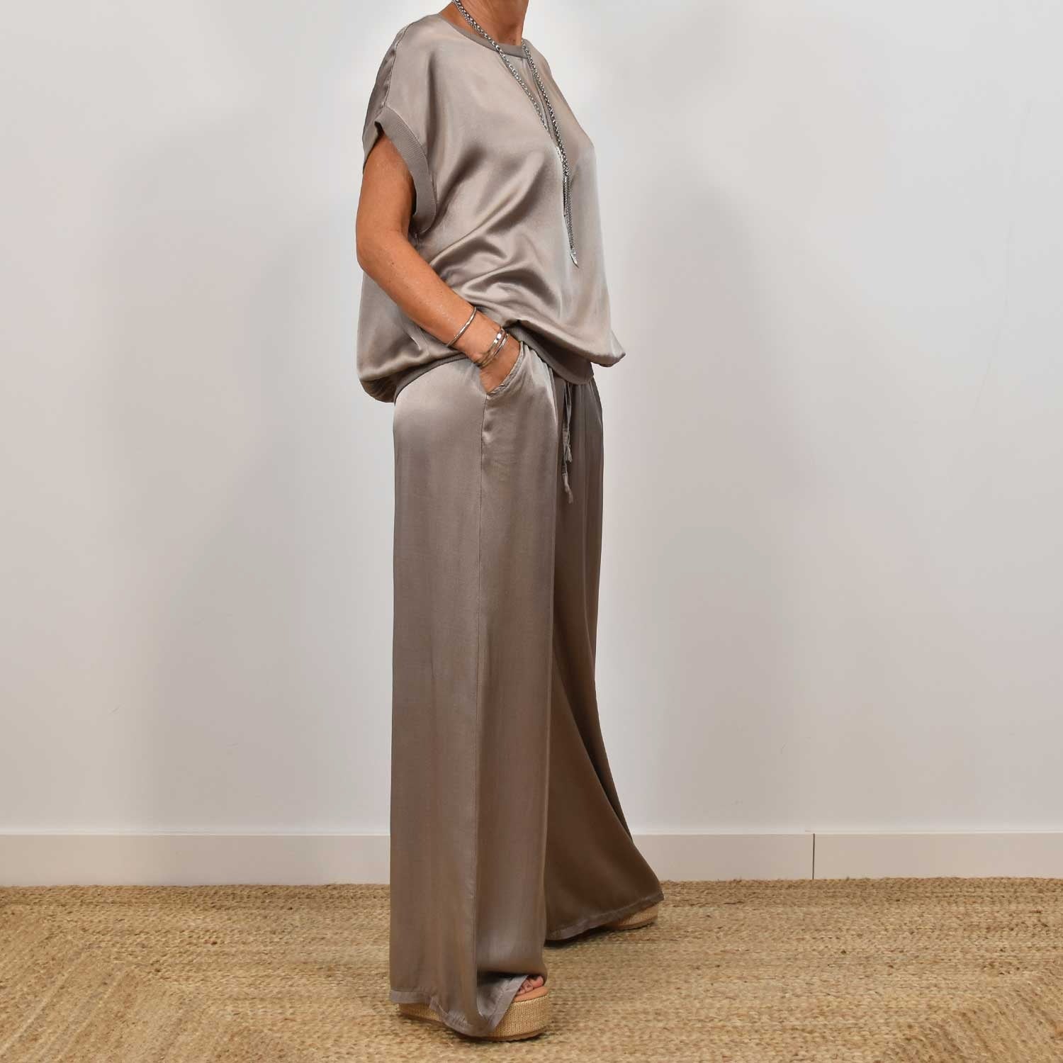Ensemble Détente Femme Satin – Deux Pièces Chic avec Pantalon Large et Haut Manches Courtes